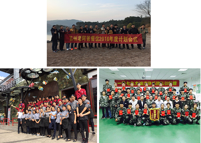 公司在2013年9月成立了老阿爸餐饮培训基地,面积200平米。每月为新入职伙伴举行岗位技能培训,及针对门店管理层实行营运、管理、安全、销售等专业培训。基地成立以来共计为各门店输送了400余名基层伙伴和30余名中层管理干部。目前有稳定的师资队伍,为老阿爸餐饮人才梯队建设打下坚实基础。