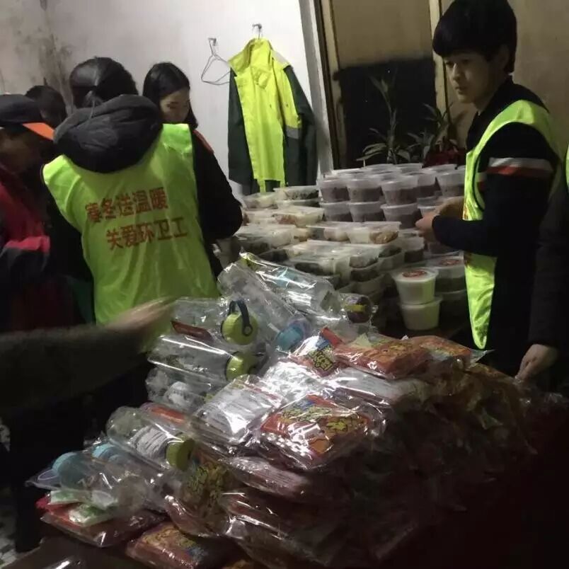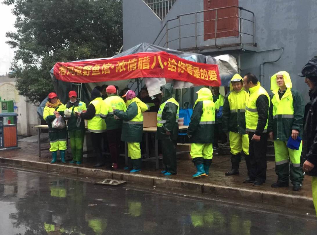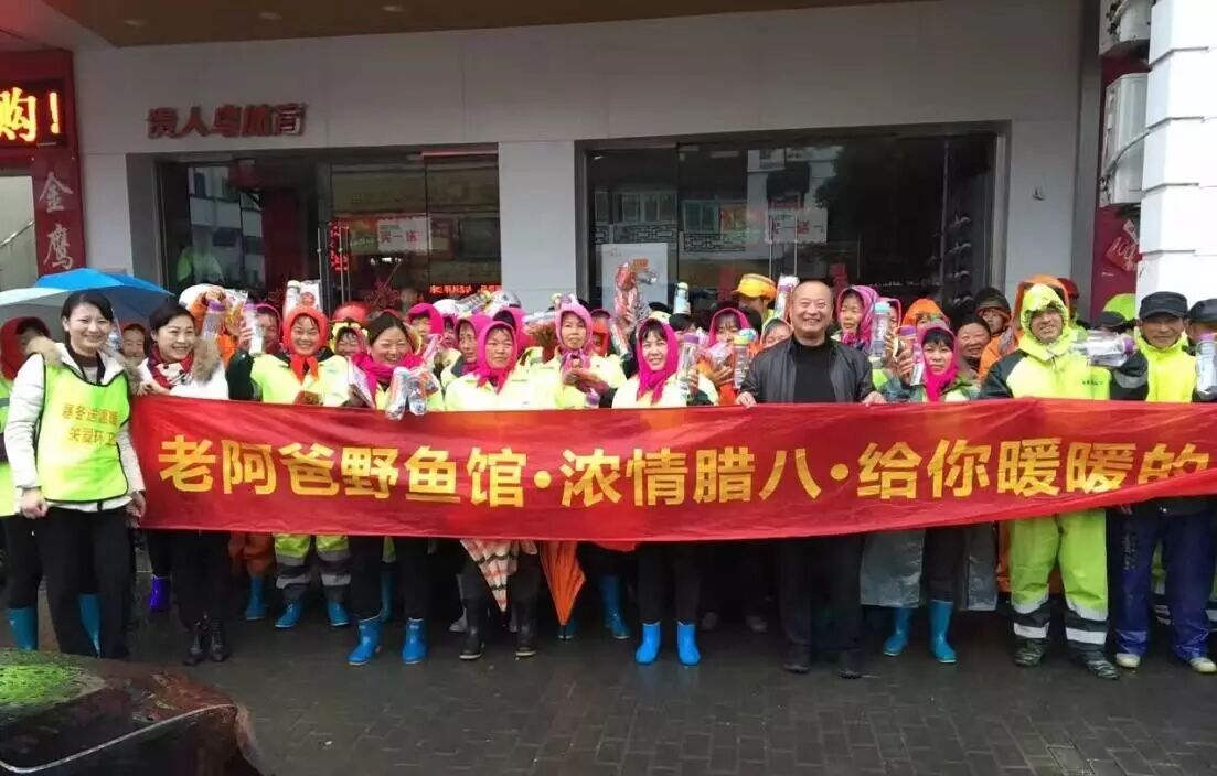 活动在1个月之前就开始筹备,老阿爸餐饮先后与昆山开发区环卫所、丽泽环卫所、朝阳环卫所;太仓城东/城西环卫所,千灯环卫所,千灯福利院,苏州吴中城南环卫所,苏州甪直环卫所的领导取得联系。老阿爸餐饮将2000份温暖香甜的腊八粥、2000个水杯、2000个“有爱”的暖手袋送到一线环卫叔叔阿姨的手中,千灯镇、太仓环卫所和吴中环卫所的叔叔阿姨,直接到老阿爸野鱼馆就餐。本次活动覆盖到9个区域的环卫工人超过2000人!还有知名企业家也加入到送温暖的队伍,为吴中区环卫所送来爱心物资!让他们在寒冷的天气里感受浓浓的温暖,以此向冒着严寒工作的“城市美容师”表示慰问和感谢。